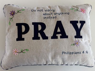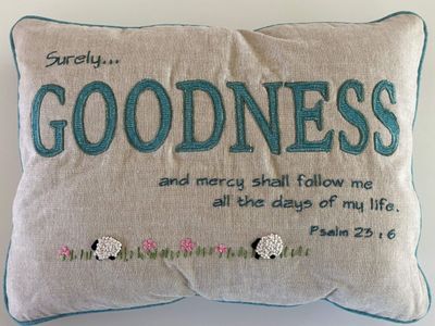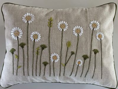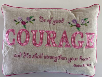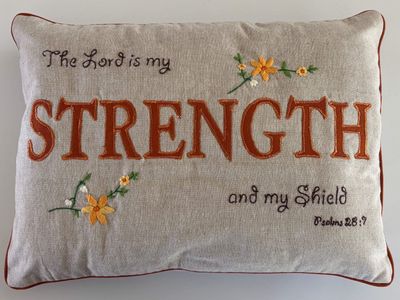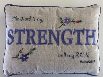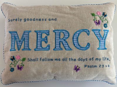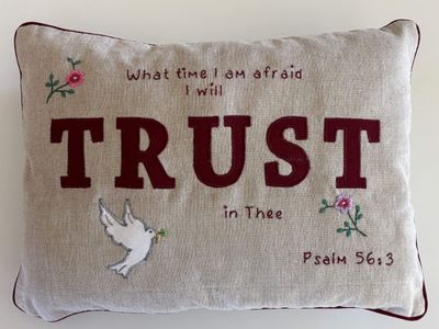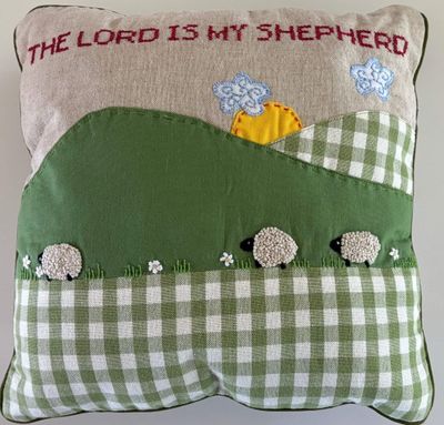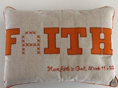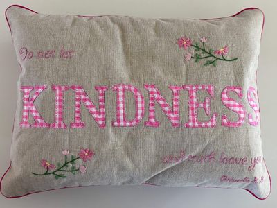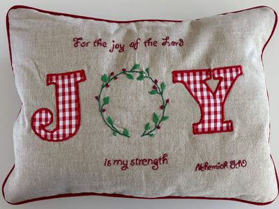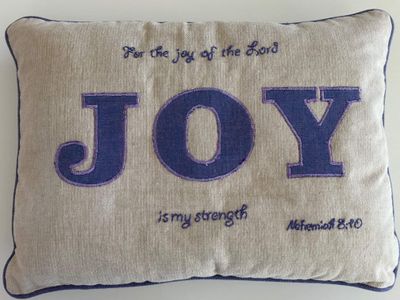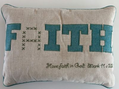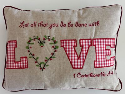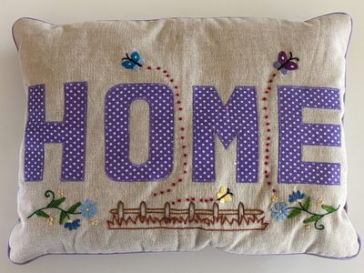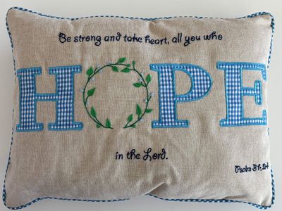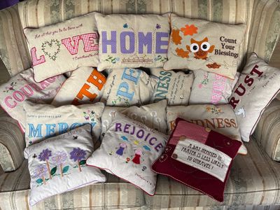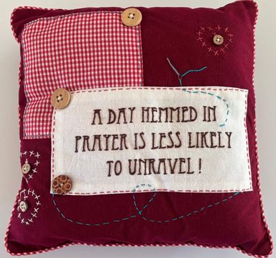 These delightful 38 x 28.5cm Cushions are designed for homespun charm, and give you an opportunity to share your faith, or encourage a friend, while supporting the Haven of Hope seamstresses in India. All but "A day Hemmed" has, at its basis, a robust beige linen fabric, handpieced with a contrasting appliqué design, and finished with charming hand embroidery. Skillfully edged with matching cotton piping, with an inset zip at the back; these cushions are already stuffed and waiting to be gifted, or perhaps to grace your recliner, sofa, or as a statement of faith on your spare room bed. Variations of rectangular cushions: