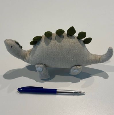 In delightful stegosaurus style, he is made of beige linen, featuring green (soft!) spines, and has delightful button detailing on each hip. Dino is just as happy standing up on all four legs on a shelf, admiring all he surveys, or being taken to bed for a cuddle.