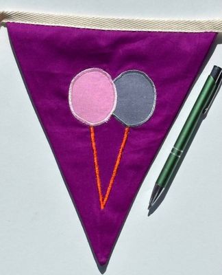This beautifully stitched cotton bunting consists of 13 triangles spelling H A P P Y B I R T H D A Y in bold appliqué lettering, plus 7 more with appliquéd balloons = 20 pennants altogether.